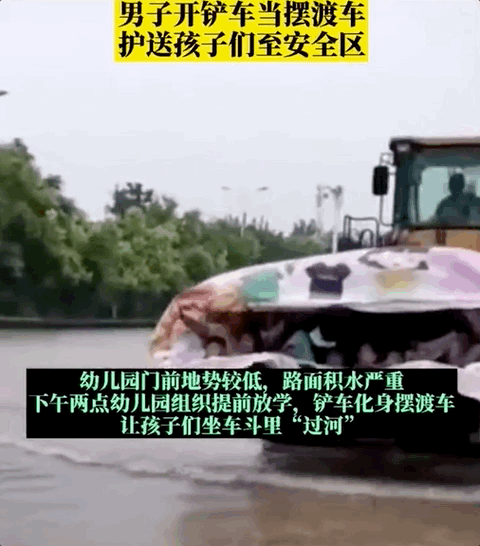 因為幼兒園門口所處地勢低,積水嚴重。剷車師傅讓孩子們坐在車斗裏,載他們“過河”。