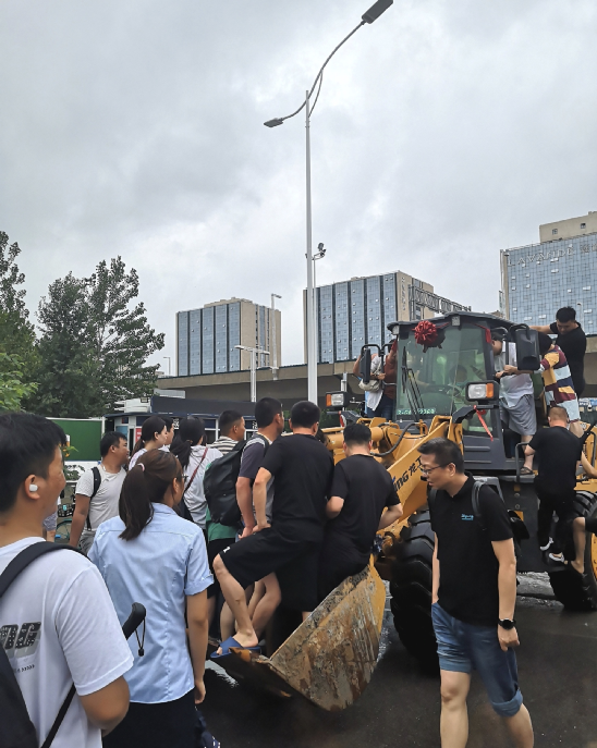 湍急的流水衝入地下室,不少人被困在地下。冒着大雨,商場工作人員和附近的市民忙起來。