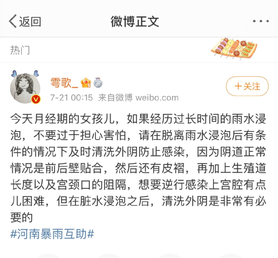 一位博主特意提醒月經期的女孩,被長時間髒污的雨水浸泡後,該如何清潔。評論區裏,人們紛紛拿出專業知識,提醒女孩們避免泌尿系統感染。