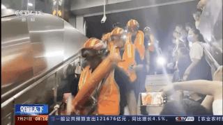 救援人員把輸水帶一頭系在台階旁的抓手上,一頭系在車廂裏,讓乘客們扶着往台階上撤離。