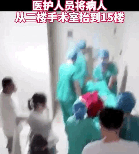 5名醫生來不及換掉手術服,戴着手術帽和口罩。他們抬着剛做完手術的病人,從2樓走到15樓,一步一個台階。