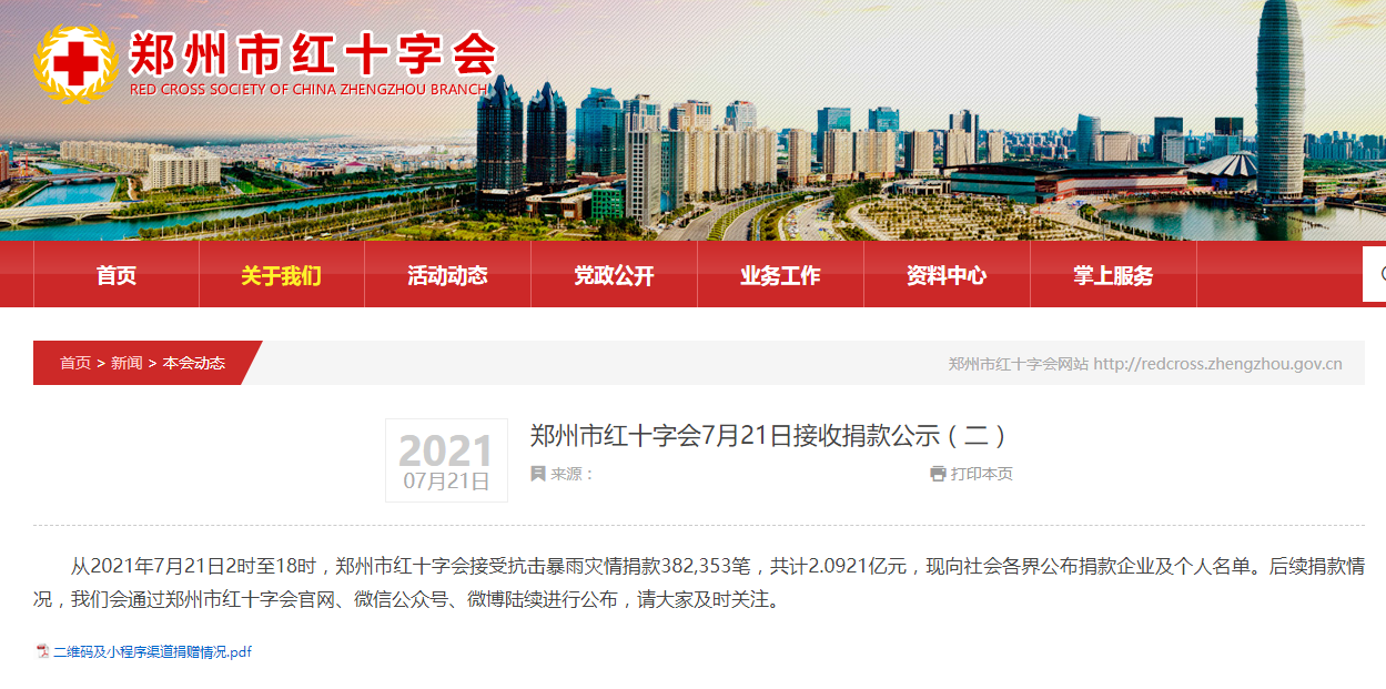 鄭州市紅十字會在官網,公佈了其7月21日接受捐款的公示。
