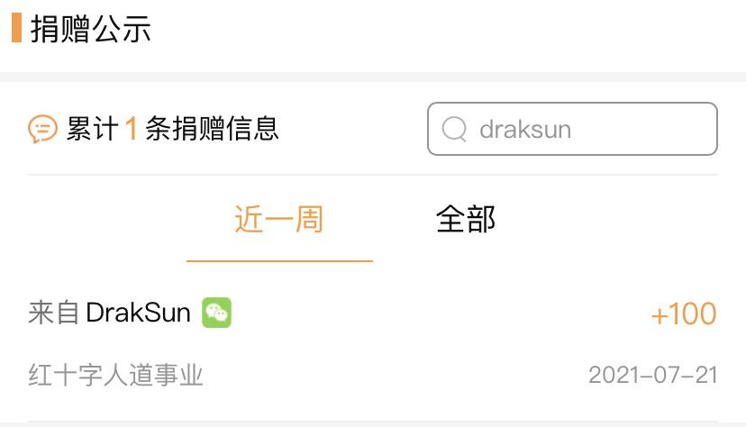 在鄭州市紅十字會微信公眾號中,以捐贈人“DrakSun”為關鍵詞,查詢到的捐贈記錄也顯示捐了100。