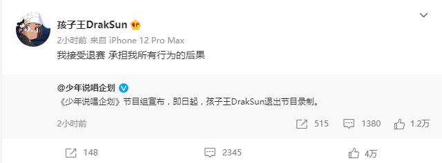 《中國説唱企劃》宣佈孩子王DrakSun將退出節目錄制,@孩子王DrakSun 説自己接受退賽,承擔所有後果。