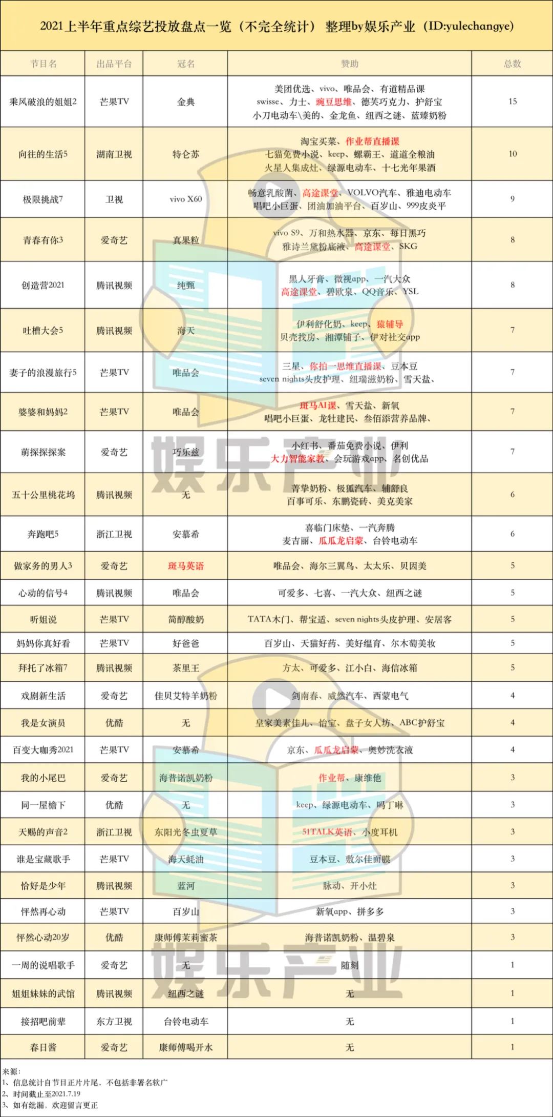 而比起衞視綜藝,網絡綜藝對品牌主更有吸引力。去年一年裏,網綜的品牌合作總數同比上升了6%,電視綜藝的品牌投放也有了相應的下降。而在娛樂產業(ID:yulechanye)盤點的2021年上半年的品牌投放中,大多數都為網綜,電視綜藝的身影寥寥無幾。