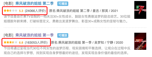 在豆瓣上,《浪姐1》總共有超過16萬人評分,分數高達6.8,而到了第二季,評分人數只有2萬多,不及第一季的七分之一,分數也掉至5.3分。