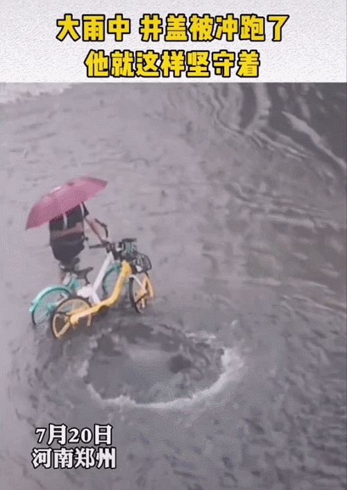 大雨中,井蓋被洪水衝跑了,
