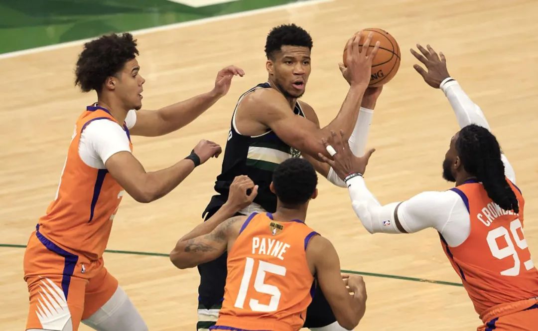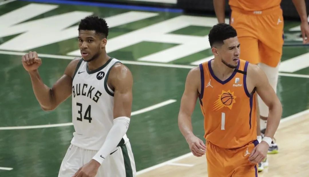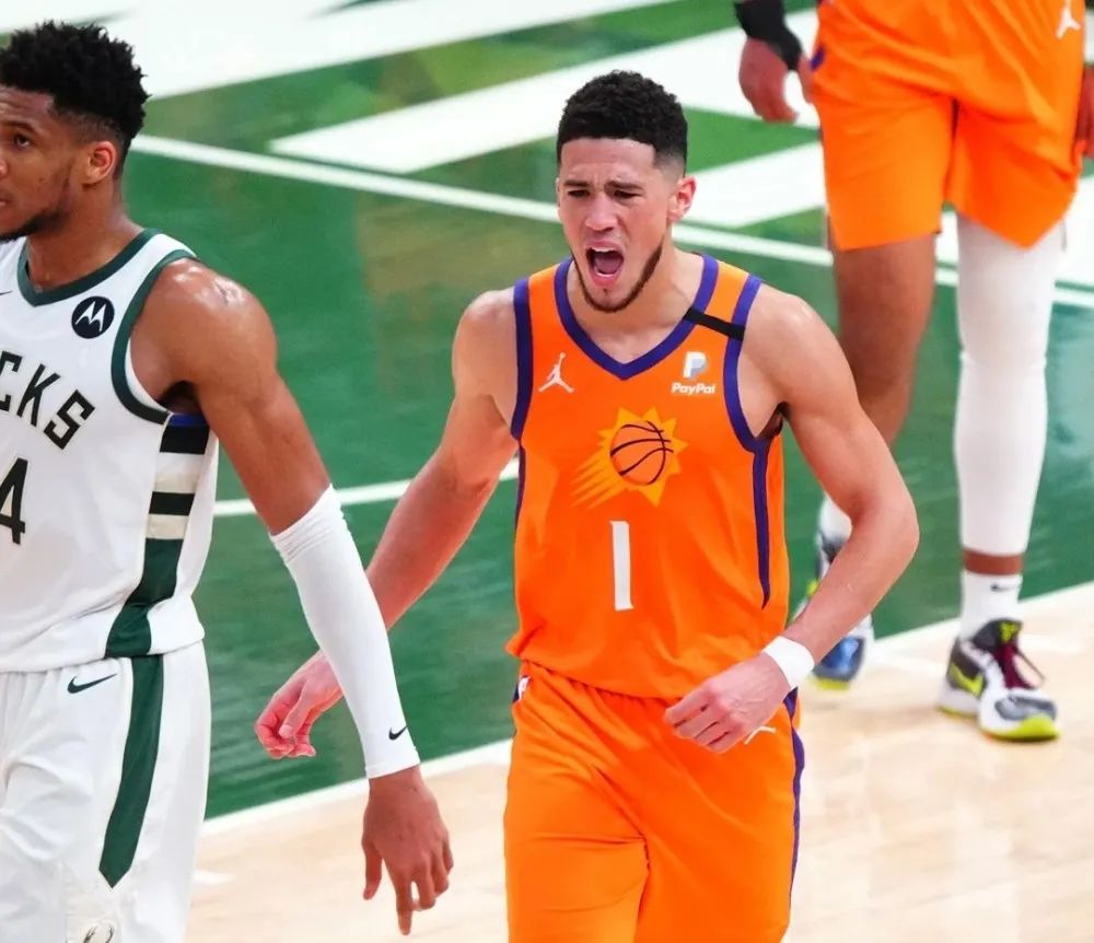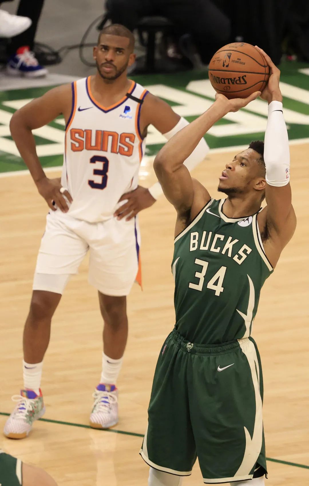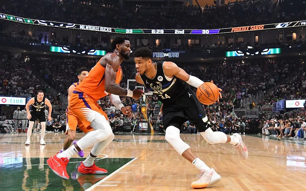 因為還有一個大前提,就是兩隊在一切發揮正常的情況下,所謂正常就是布克和字母發揮出前5場的平均水準,布克拿個30分左右,字母砍個30多分,這兩個球隊的絕對核心要在一條起平線上。