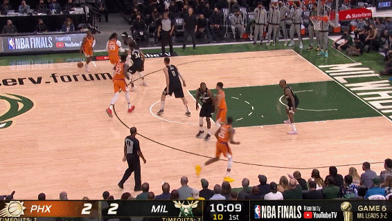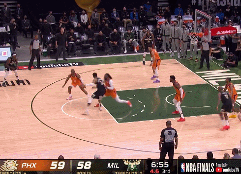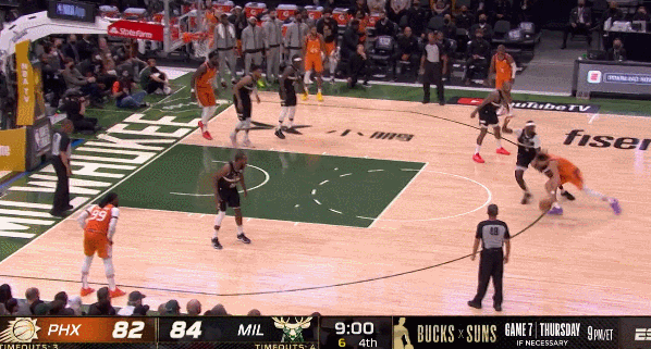 他可以在防守端大帽太陽的進攻之後,立刻又衝到全隊第一線下快攻,他像是永遠不知疲倦似的,可以奔襲在球場的兩端。此時此刻你不得不再次感慨字母的身體天賦,別忘了,他還在東決以那般令人揪心的姿勢扭傷過自己的膝蓋。