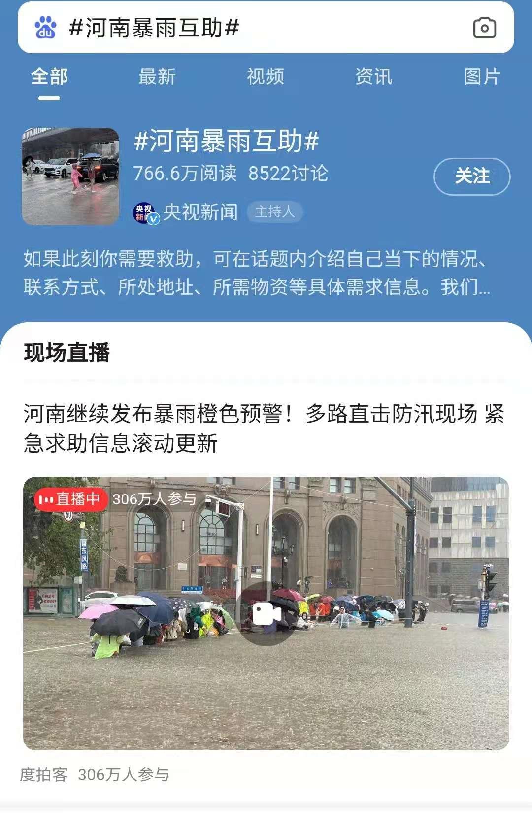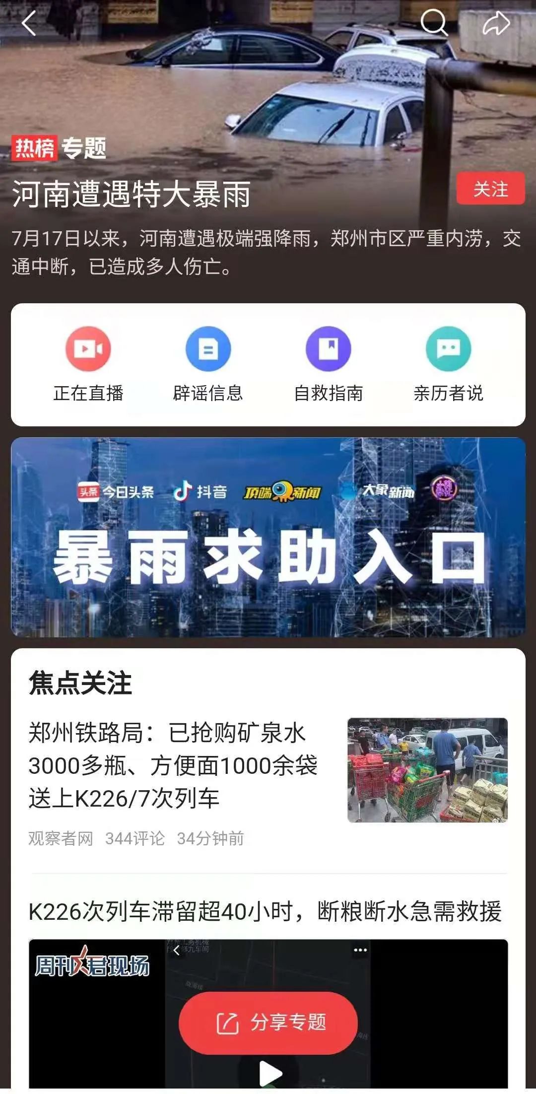 同時多家移動內容分發平台,還紛紛上線【河南暴雨】專題以及直播,第一時間發佈汛情相關消息,並公佈自救方式和救援電話等信息。