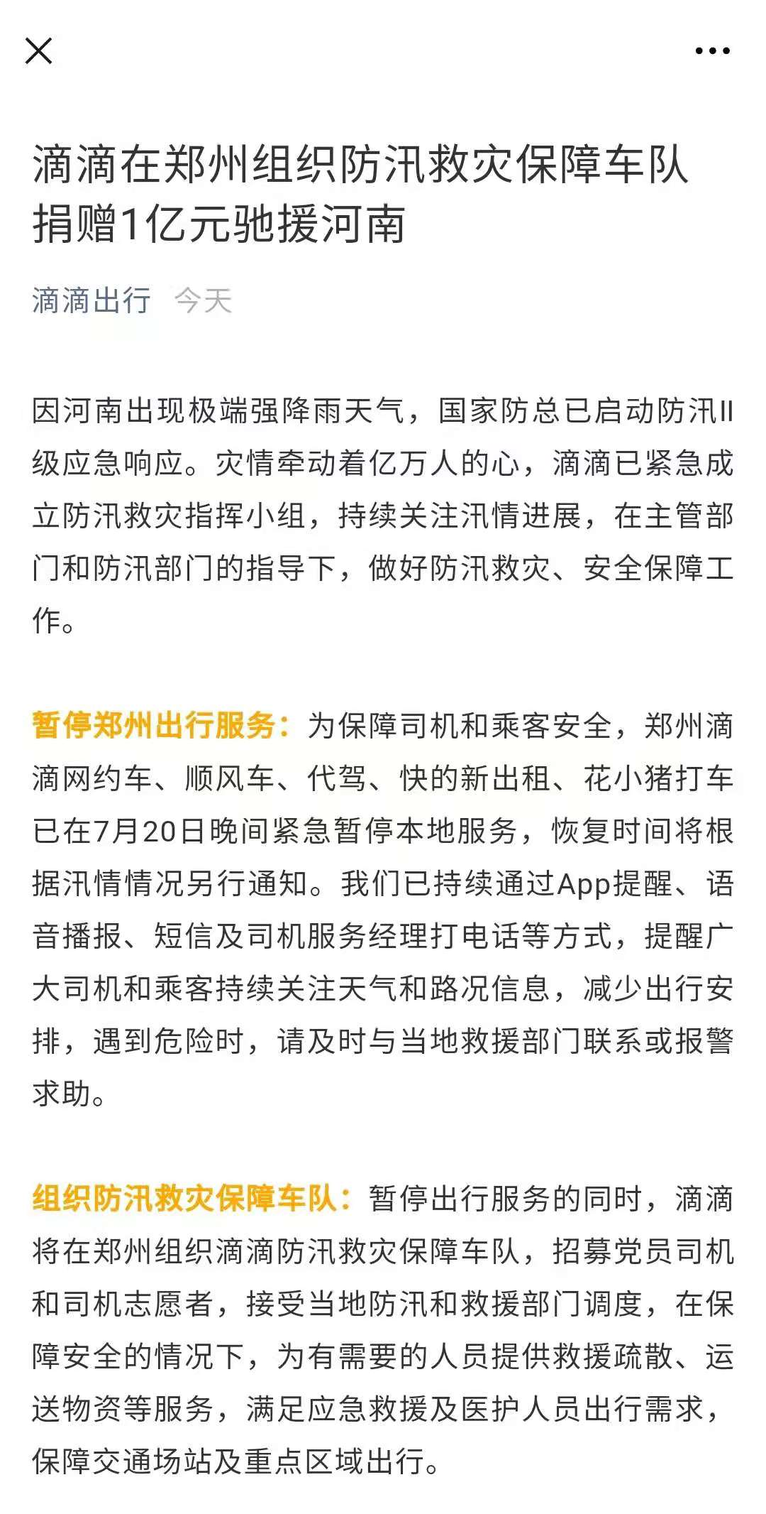 滴滴將在鄭州組織滴滴防汛救災保障車隊,招募黨員司機和司機志願者,接受當地防汛和救援部門調度,在保障安全的情況下,為有需要的人員提供救援疏散、運送物資等服務,滿足應急救援及醫護人員出行需求,保障交通場站及重點區域出行。