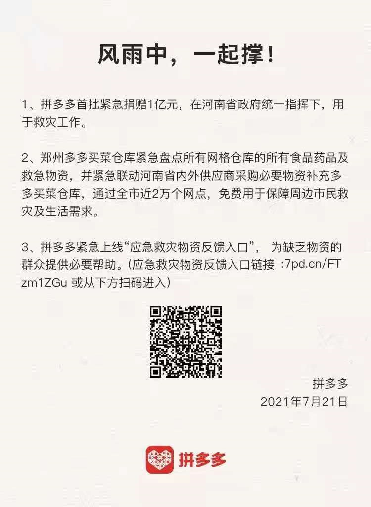 同時,拼多多技術團隊第一時間開發上線“應急救災物資反饋入口”,收集受災地區抗災需求,提供信息對接和物資支持。受災羣眾及相關社會機構均可通過此入口反饋相關信息,協助受災羣眾共同抗災。