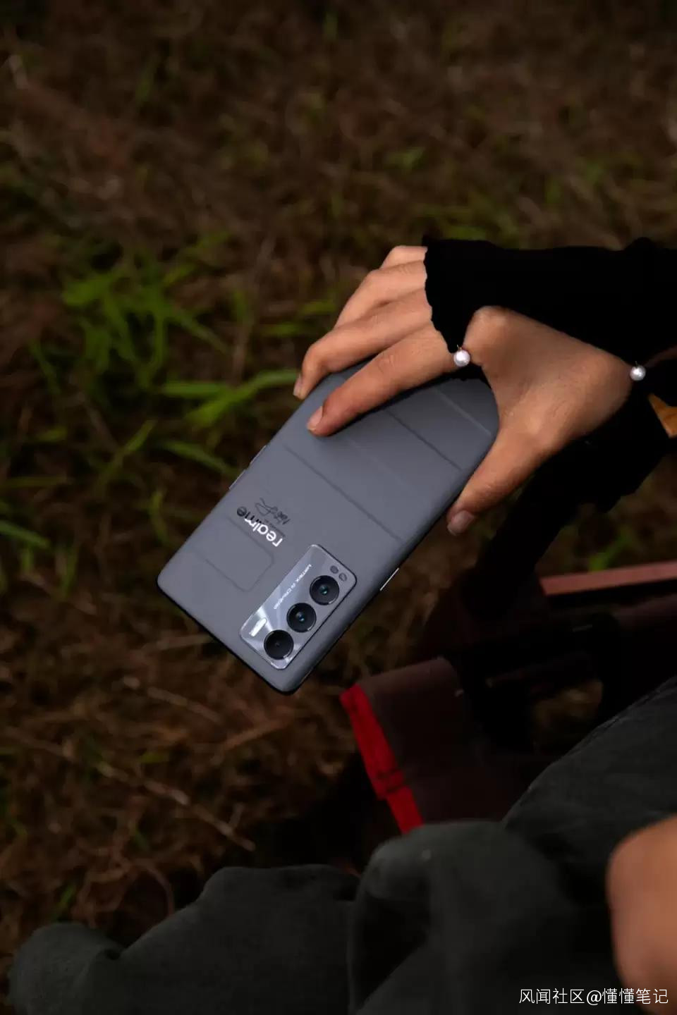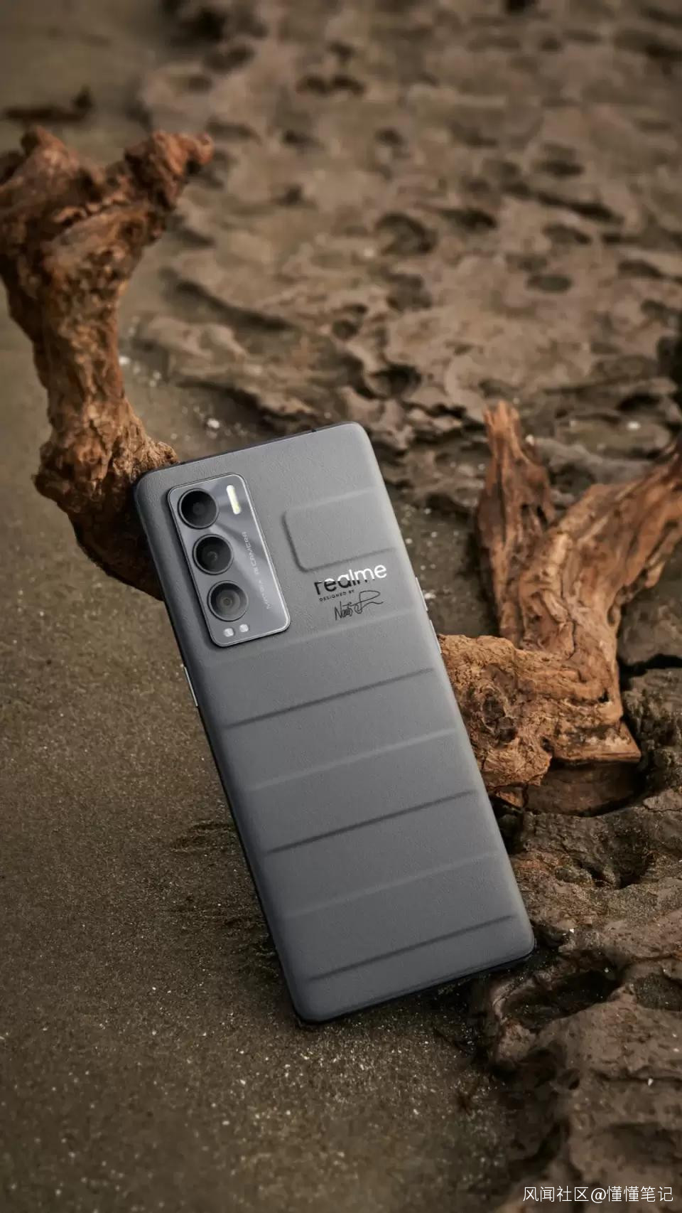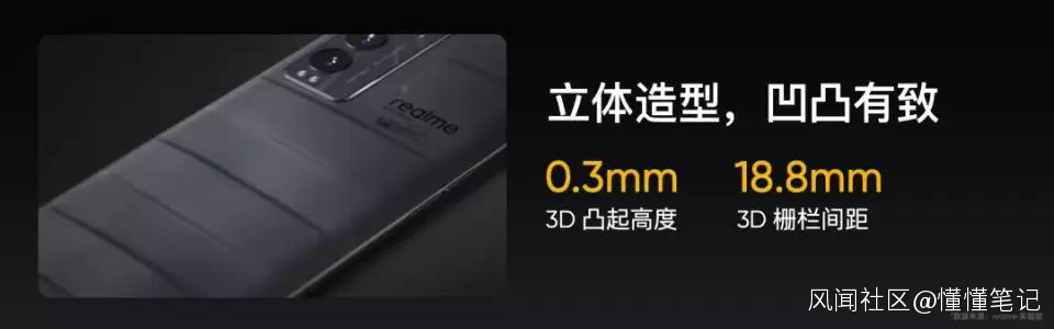 一個設計靈感在手機中落地,主要依靠形、色、材質。格柵設計原本是為了加強旅行箱結構,將經典起伏格柵復刻到手機外觀上,帶來堅固而踏實的心理感受。在顏色的選擇上,灰色和杏色兩種配色方案,一方面給人以高級感,另一方面也給人以平和舒適的感覺,温和的顏色迎合絕大多數用户的喜愛。加上後置鏡頭模組旁邊鑲嵌的realme金屬LOGO,進一步提升整機的精緻感。在材質的選擇上,真我GT大師探索版在業界首款採用立體3D素皮工藝,既有親膚之感,又呈現出高級的質感。