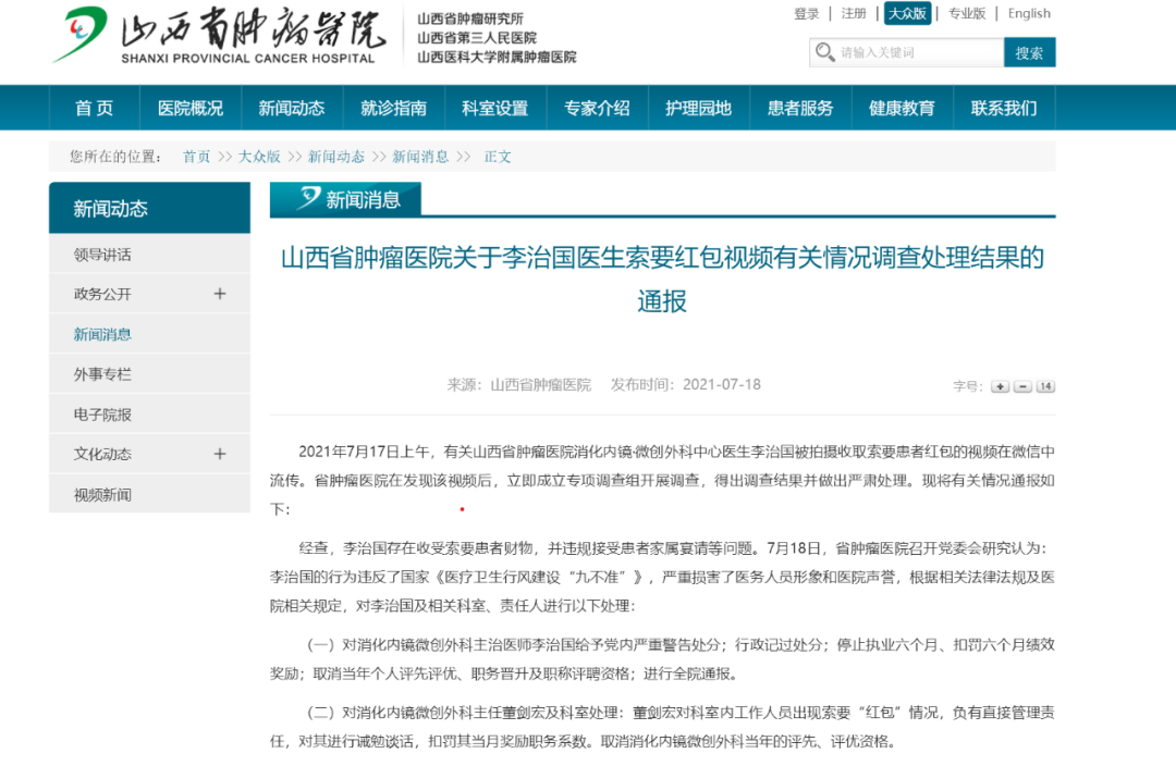 2019年7月,山西省相關部門出台了一則《關於開展醫療衞生行業醫德醫風專項整治工作的通知》。