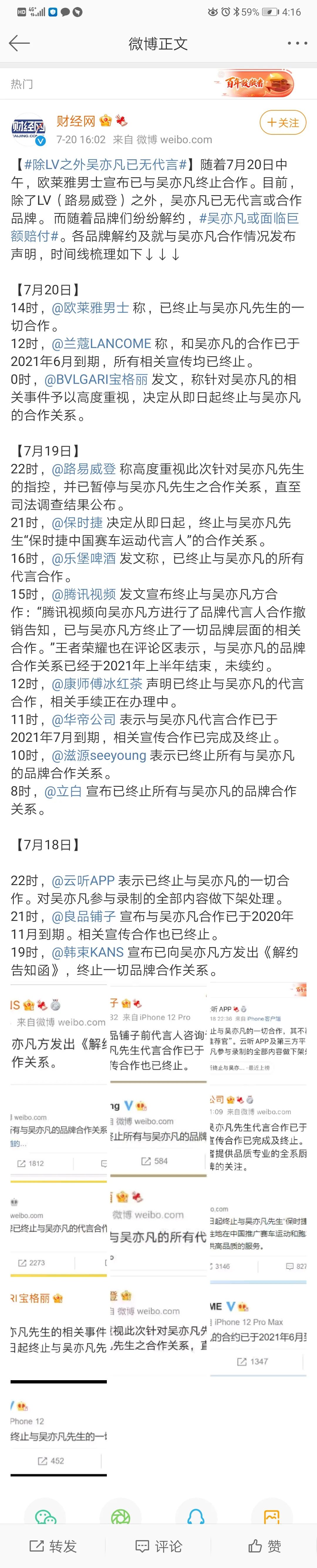 截至昨天,已有大量曾與吳亦凡合作的品牌宣佈與他劃清界限。