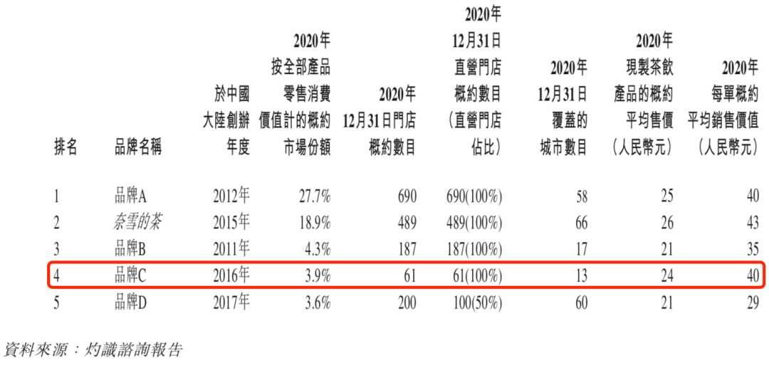 這一點可以參照奈雪招股書。一位業內人士稱,從成立年份可以判斷出,圖中品牌A為喜茶,品牌C為樂樂茶。若這一説法準確,那麼喜茶到2020年年底共有690家門店,奈雪有489家,而樂樂茶僅有61家;喜茶到2020年年底覆蓋的城市數達58座,奈雪覆蓋66座,樂樂茶僅覆蓋13座。