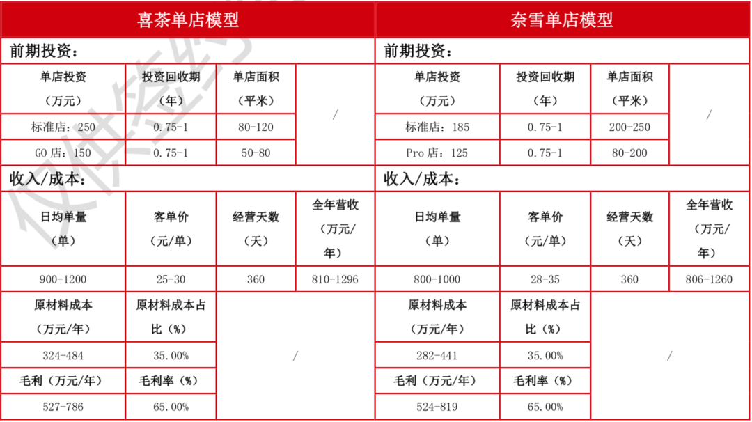 根據國融證券研究與戰略發展部的報告,喜茶標準店坪效為6.75-10.8萬元/米,奈雪標準店坪效為4.0-5.0萬元/米;對比喜茶和奈雪的茶的單店銷售模型,可以發現喜茶通過小店型 (即更小的店鋪面積、更少的員工薪酬與店鋪租金支出) 獲得了比奈雪更高的單店收入、經營利潤率和單店坪效。