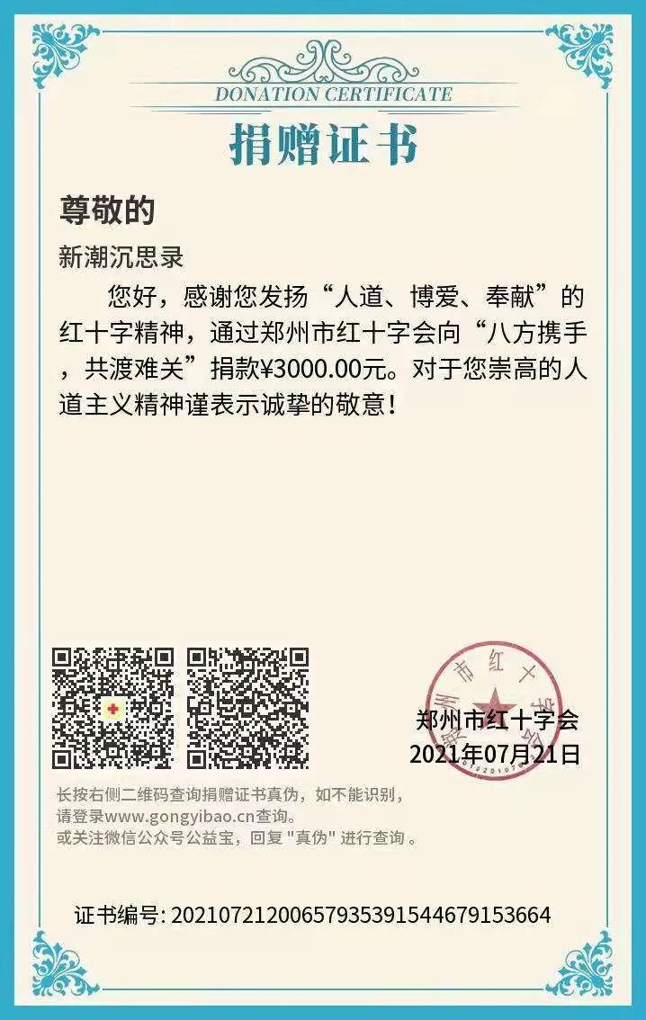 在此向所有參與救災的人們致敬。今天謹以沉思錄編輯部名義向災區貢獻一份微薄的力量,同時感謝我們的幾位作者,acel rovsion,北方朔風,dlsdyc,飛劍客,新華門的卡夫卡,黃三思,懶殘僧,劉夢龍,雙瞳等,貢獻了一部分稿費,參與了本次捐款,同我們一起為河南同胞表達一份心意。