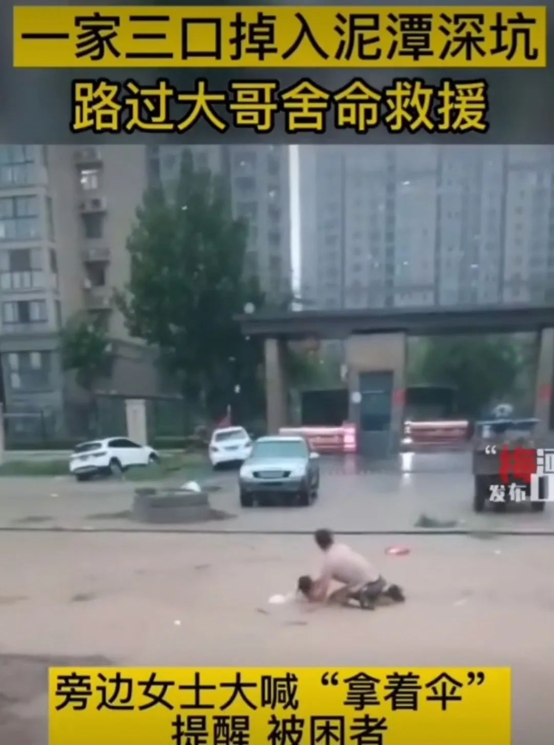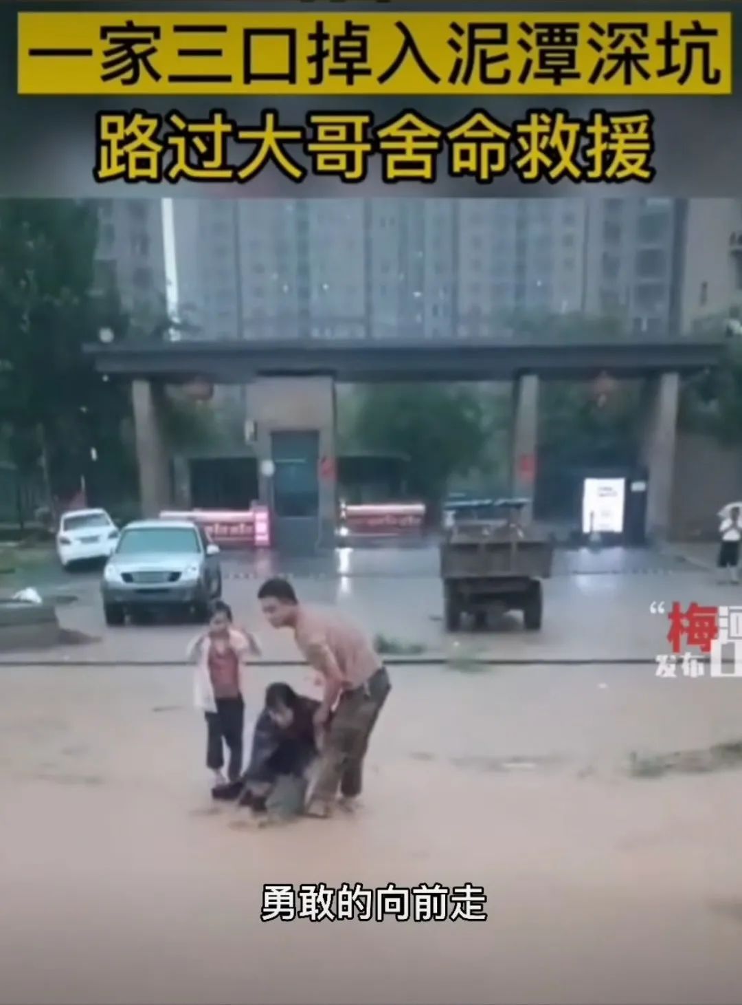 一家三口掉入泥潭,已經淹沒了頭頂。絕望之中,一位路過的大哥跪在地上,將母親和兩個孩子一個一個拉了出來。