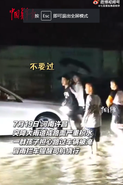 河南許昌,暴雨讓道路積水嚴重,一羣孩子冒雨站在路中攔車,大聲喊着“不要過!”