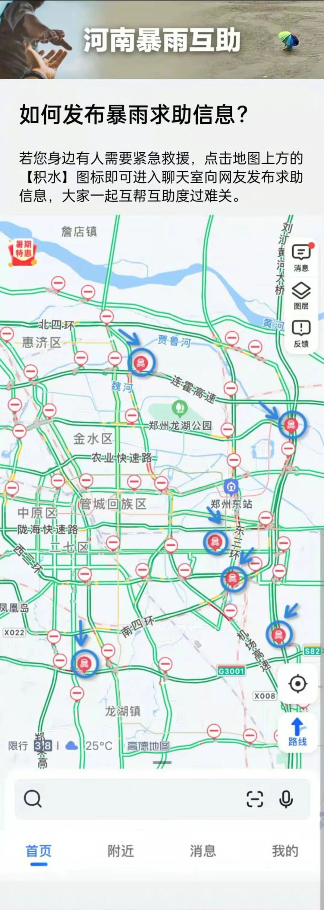 高德地圖也率先上線互助通道功能,幫助市民快速查詢救援隊電話、附近避難場所信息以及發佈求助信息。