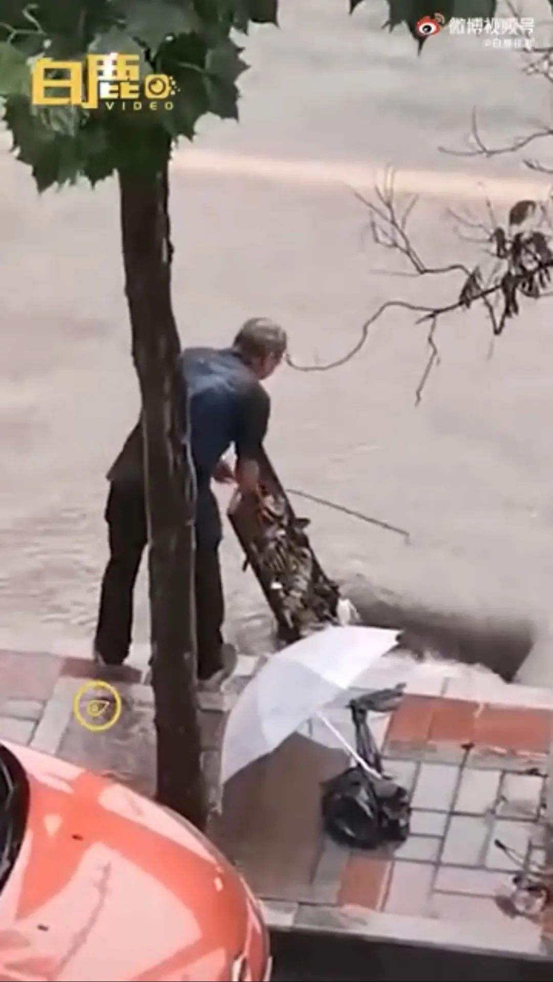 積水嚴重的路面,一位大爺正冒着雨蹲在路邊,清理井蓋上的雜物,清理完之後,又將井蓋打開方便排水。