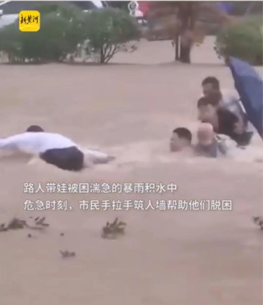 人們手拉手,組成了人牆,穿白襯衫的大哥拼盡全力,腳下滑了一跤,還是拽住了撐不住的父親。