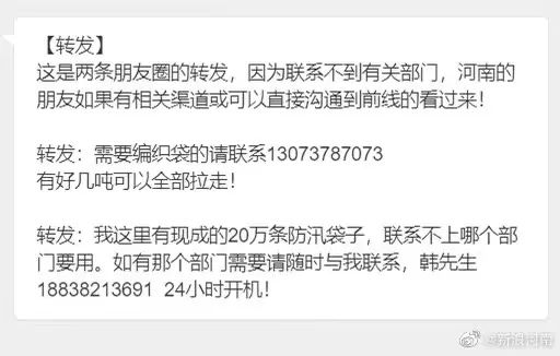 比如來自不同省市的工廠,紛紛請求捐獻編織袋/沙袋。
