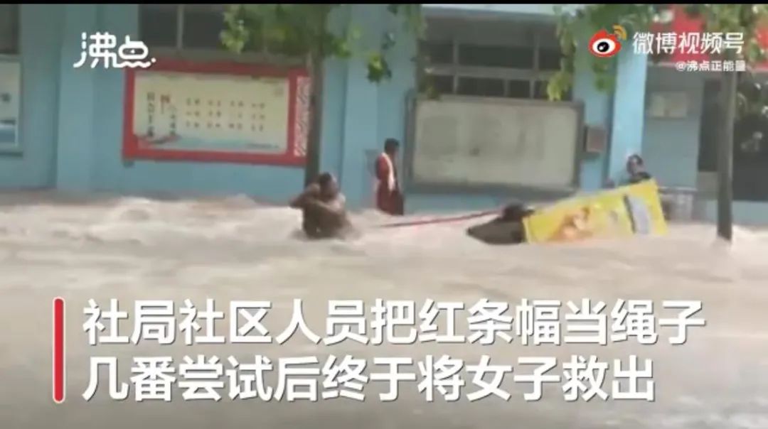 大水漫灌,連冰箱都被沖走。附近社區的工作人員找不到專業的救援物資,就用平日宣傳用的兩根紅條幅捆成救援繩,把她救了回來。