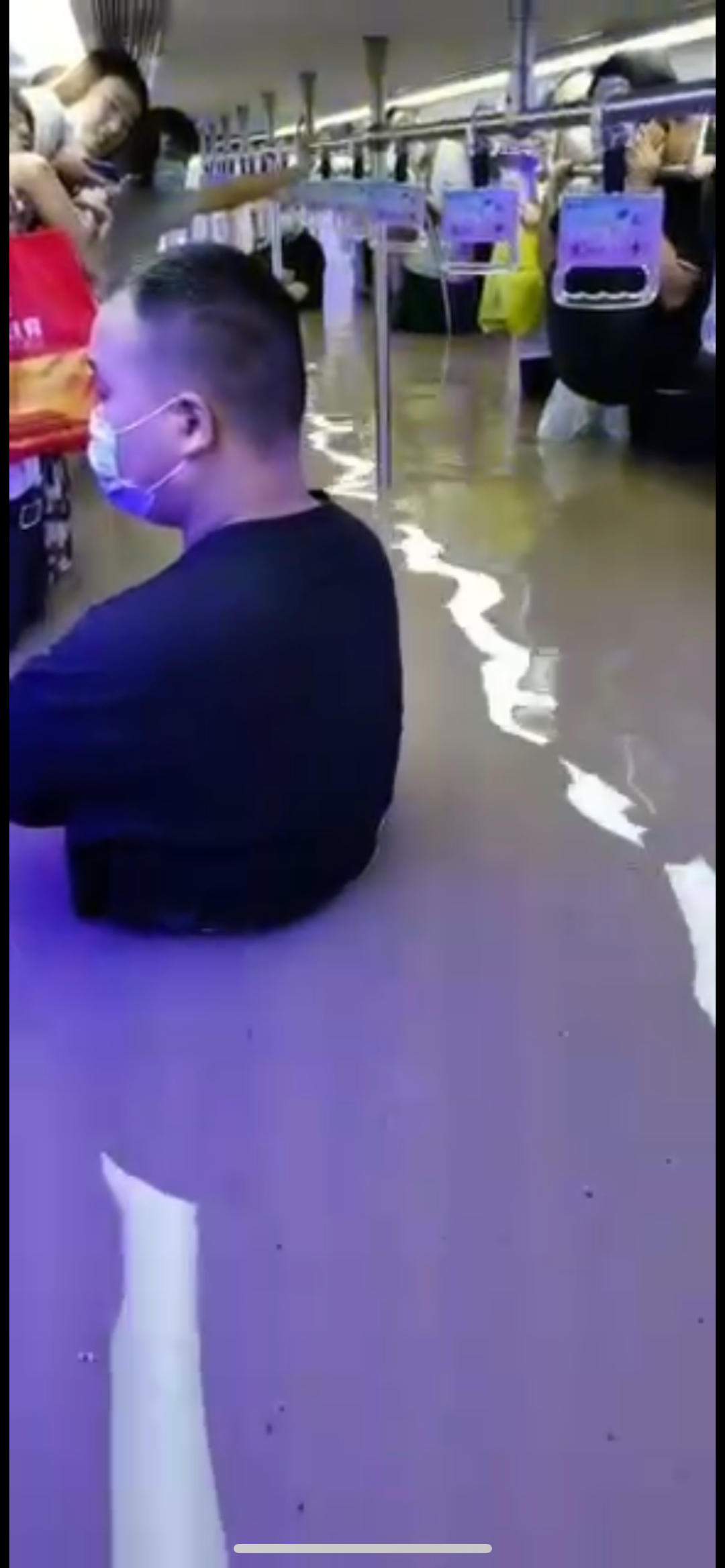 在那些驚心動魄的視頻裏,有人站在地鐵的座位上,水已經沒過了腰;