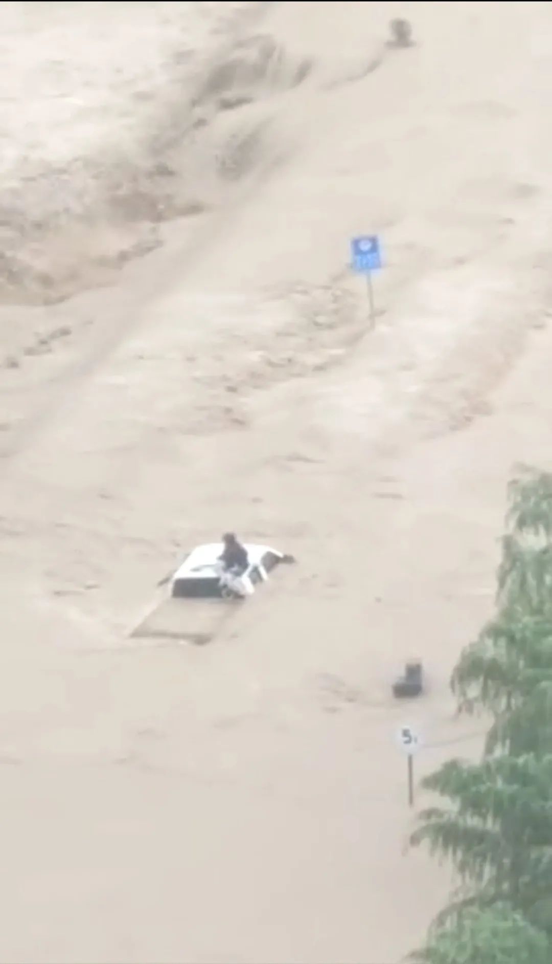 有人爬到車頂,周圍茫茫洪水攜裹着漂浮的汽車,他無處可去……