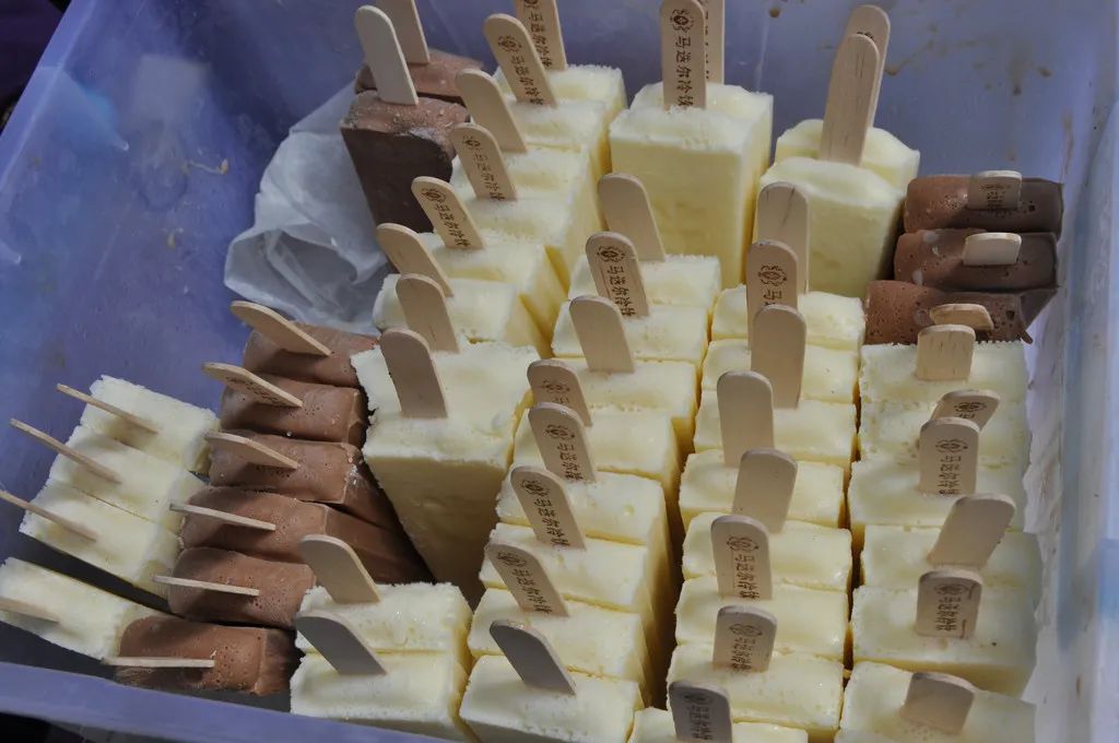 不僅“店鋪”簡陋,冰棍的花樣也不多。白色是原味的,有一種淡淡的奶香,棕色是巧克力口味。即便是這樣,冰棍依舊受到了孩子們的熱烈歡迎。為了保護好它們,“店主”還會在保温箱上蓋幾層厚厚的毛巾。