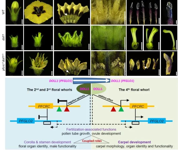 具體來説,在心皮中PFGLO1基因可以提高PFCRC的表達量,從而藉助PFCRC的能力影響心皮發育;那麼這就可以解釋在雙層燈籠的突變體中為什麼心皮的發育受損了:PFGLO1功能缺失後,PFCRC在心皮中的表達量也低於正常量了,影響了正常的心皮發育。