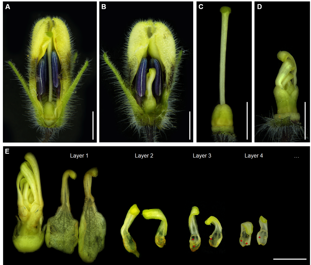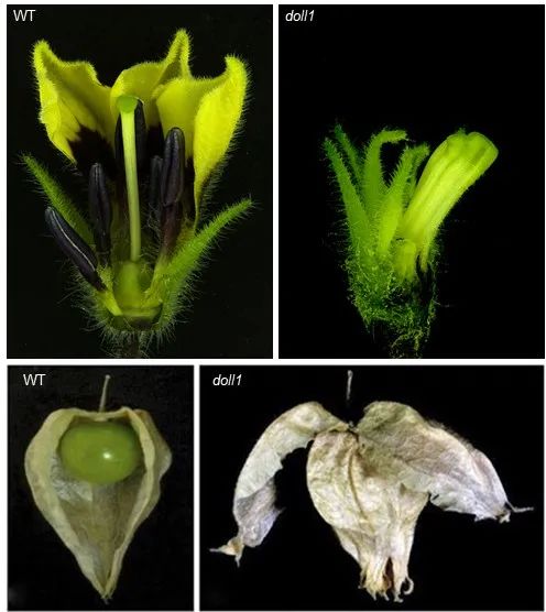 中科院植物所賀超英研究組在前期的工作中,獲得了一個毛酸漿“雙層燈籠”突變體。從花來看,原本黃色嵌有紫色斑點的花瓣在這個突變體中變成了綠色的萼片;雄蕊也消失了,變成了類似雌蕊的結構。在人工授精後,這個突變體的兩層花萼迅速膨大,長成了兩層燈籠。這個表型與經典的B功能基因缺失突變體類似。
