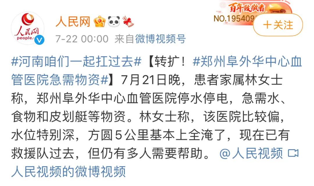 他有一個阜外醫院的訂餐羣,裏面有人發信息説:“各位老師,大水無情,人家有愛,現有阜外醫院的職工與病屬被困,物資缺乏,我們現在做好出發的有500份餐左右,水,紙,但是我們已經繞了4個小時的路程,實在是過不去了,請社會各界人士轉發,尋求一下皮划艇,小船,或者熟悉當下路況可以幫忙給帶過去……”