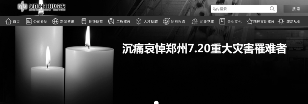 鄭州地鐵公司的官網也改為了黑白色,悼念在暴雨中逝去的同胞。