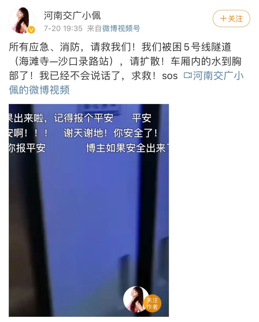 這期間,還有很多人通過社交媒體向外求救,河南交通廣播記者小佩發微博寫道: