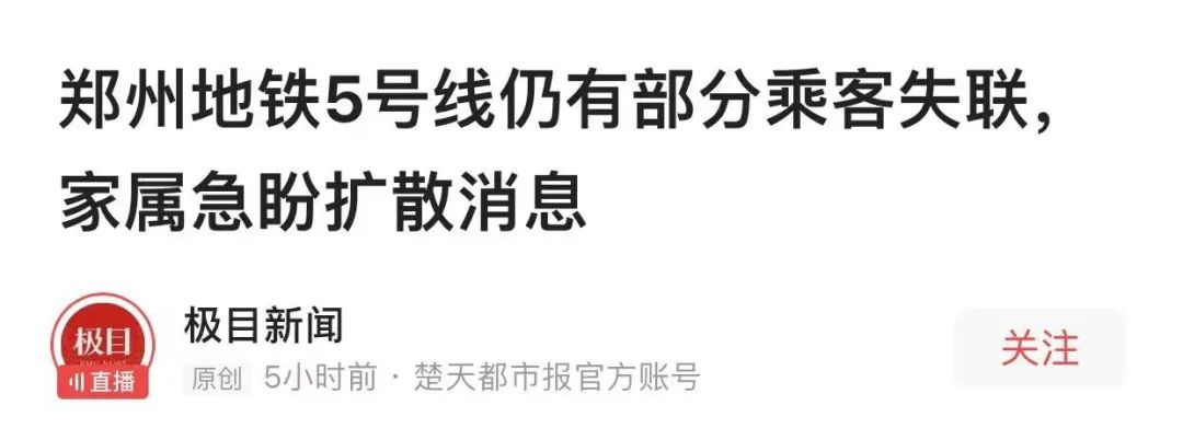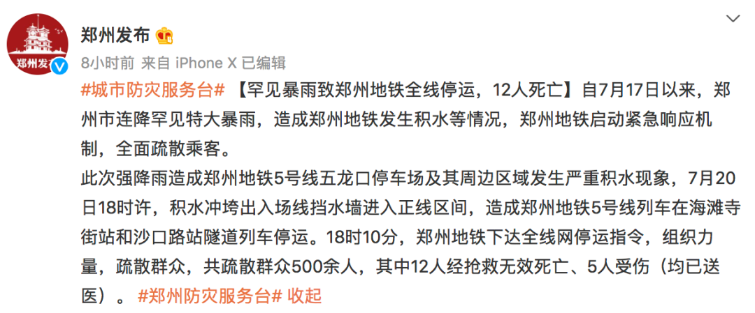 紅星新聞:《鄭州暴雨已致12人遇難 生還者講述:被困地鐵一夜,我回家了》