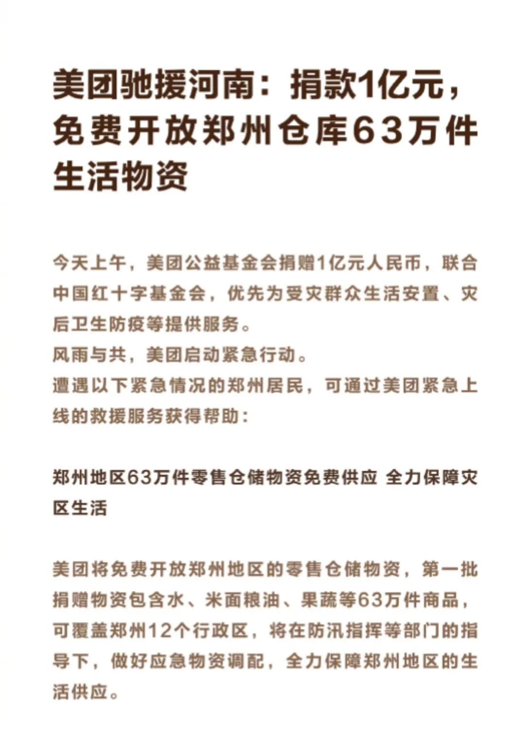 鄭州居民還可通過美團緊急上線的救援服務獲得幫助,鄭州地區含水、米麪糧油、果蔬等63萬件商品物資免費供應。