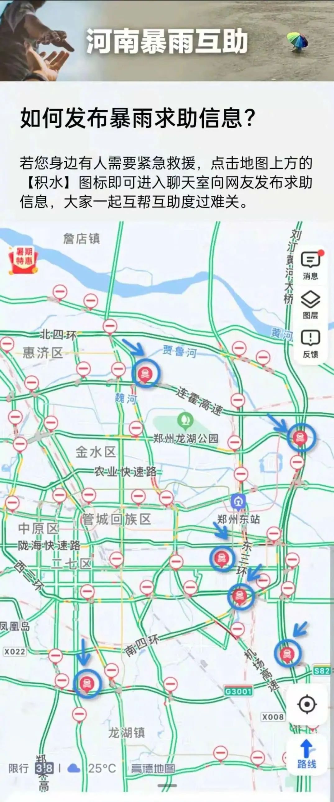 高德地圖發佈了“河南暴雨積水地圖”,用户點擊地圖上的【積水點】,就能進入相關聊天室,發佈求救信息,並獲得救援隊電話等訊息。