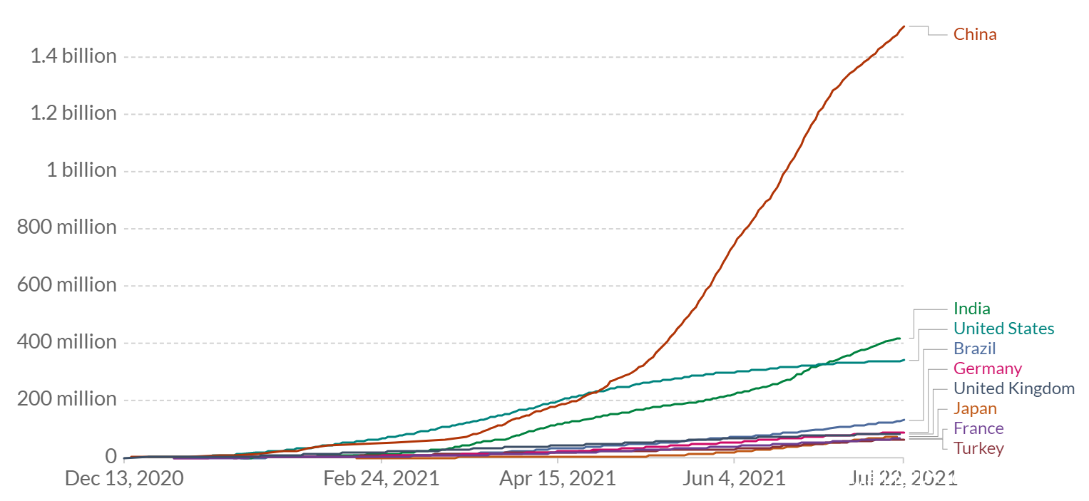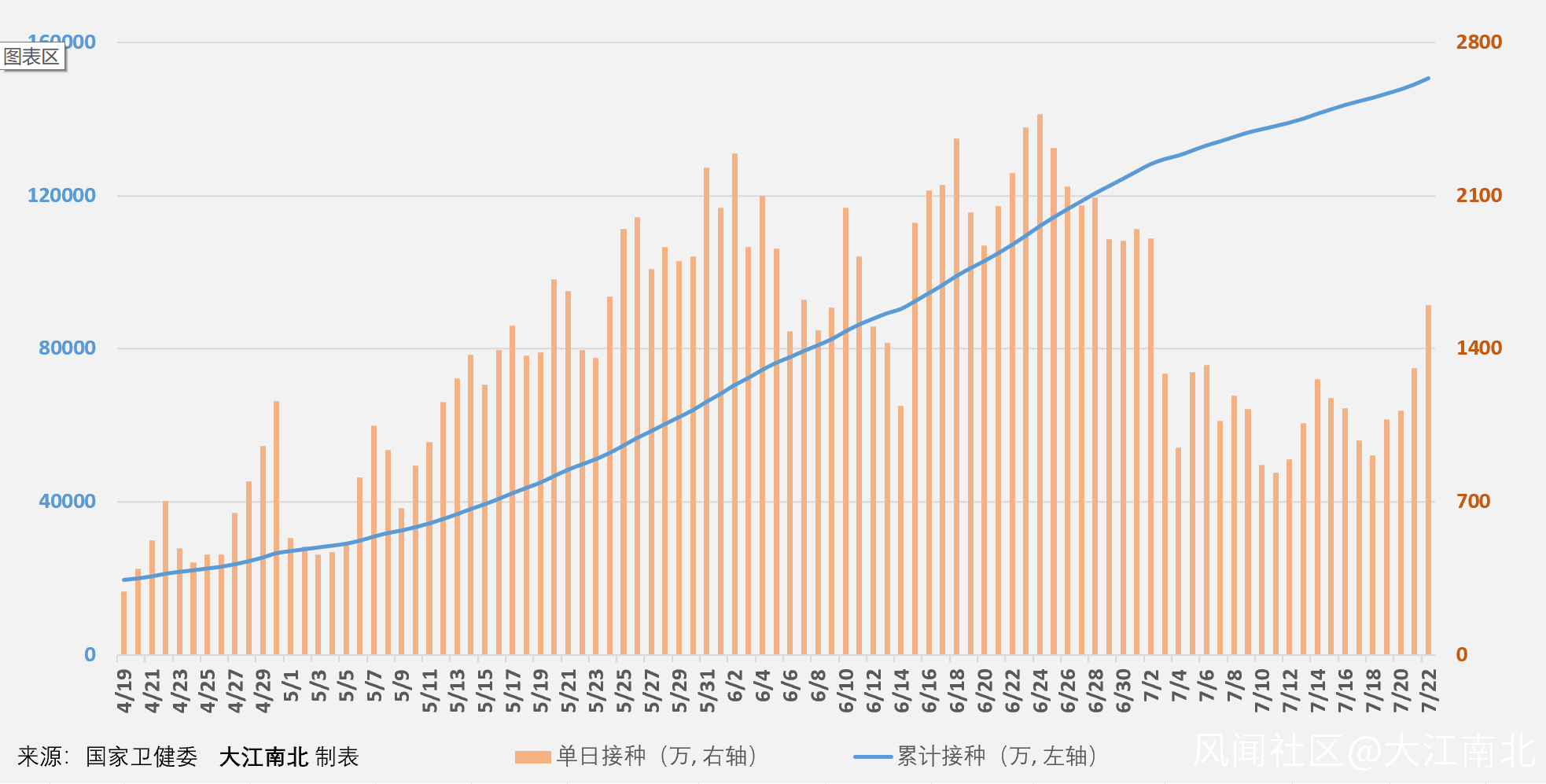 截止2021年7月22日,中國大陸累計接種新冠疫苗15.076億劑,突破15億劑大關,繼續位居全球第一位,佔全球累計接種劑數的39.8%;其中單日新增接種1600****萬劑,受南京疫情影響顯著反彈,佔全球單日接種劑數的60.6%。我國自3月23日以來,日均接種1170萬劑。中國每百人累計接種106.79劑,環比增加1.14劑,是美國的1.051倍。
