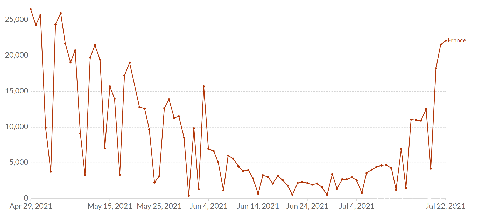 全球疫情第五大國法國新增21,909例,創5月5日以來新高,累計確診593.35萬例;預計法國疫情將持續反彈。