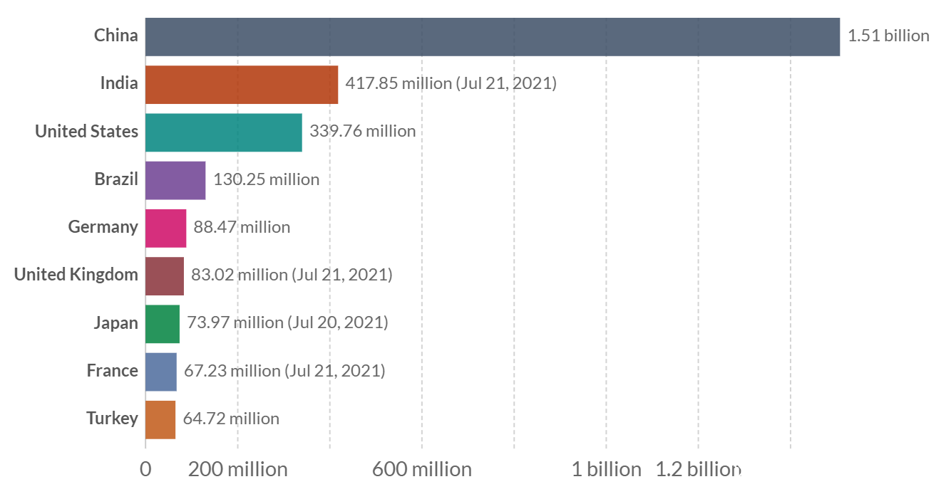 截止2021年7月21日,印度累計接種4.1785****億劑,列第二位,**其中單日新增接種238萬劑。**印度至少接種一劑的人羣佔比為23.8%,完成接種的人羣佔比為6.3%。印度每百人累計接種30.28劑,是中國的28.7%。自3月23日以來,印度日均接種305萬劑,為中國同期日均接種數的26.2%。(印度數據未更新)