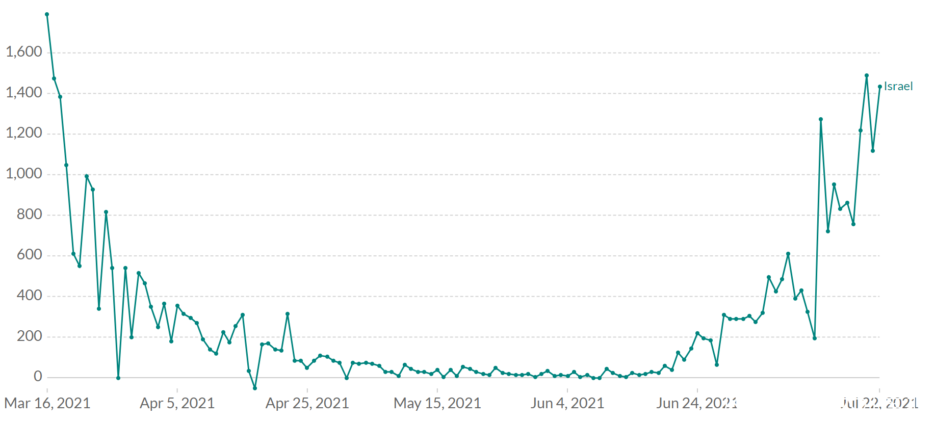 巴西、德國、英國、日本、法國、土耳其分列四到九位。**統計數據表明,以色列新增感染患者中****80%**是已經完成輝瑞疫苗接種的。英國新增感染患者中一半至少接種了一針,疫苗不能完全阻止新冠病毒的傳播。