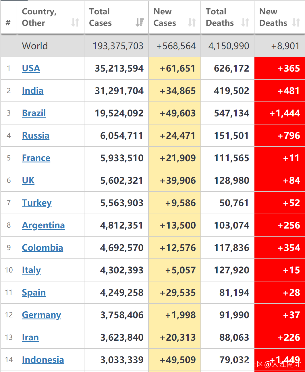 7月22日,**全球新增新冠確診568,564例;**累計確診1.9338億例;新增病亡8,901例;累計病亡415.10萬例。