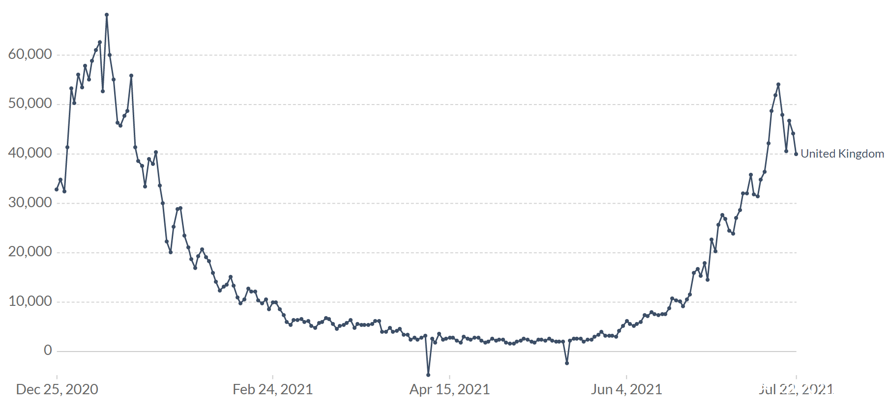 全球疫情第六大國英國新增39,906例,累計確診560.23萬例;英國疫情持續處於高位。