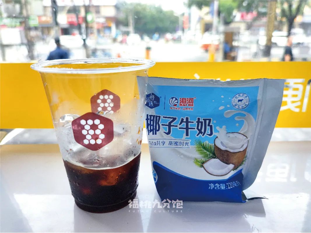 製作配比:冰杯裏倒入咖啡液,一袋椰子牛奶,攪勻即可