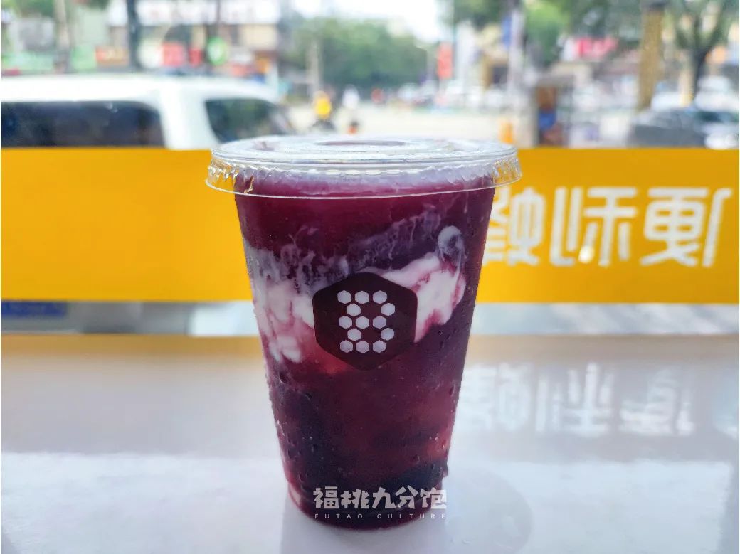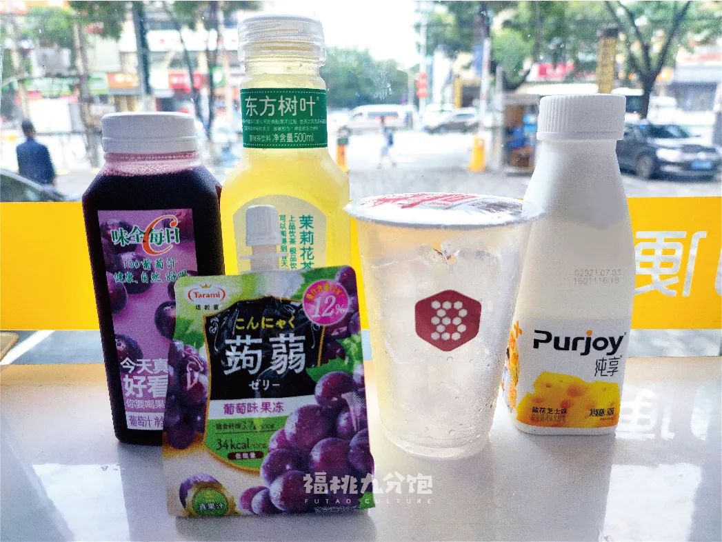製作配比:擠1/3的果凍到杯底,隨後加入1/3瓶茉莉花茶,再加入1/3葡萄汁到九分滿,最後倒上酸奶就完成啦!