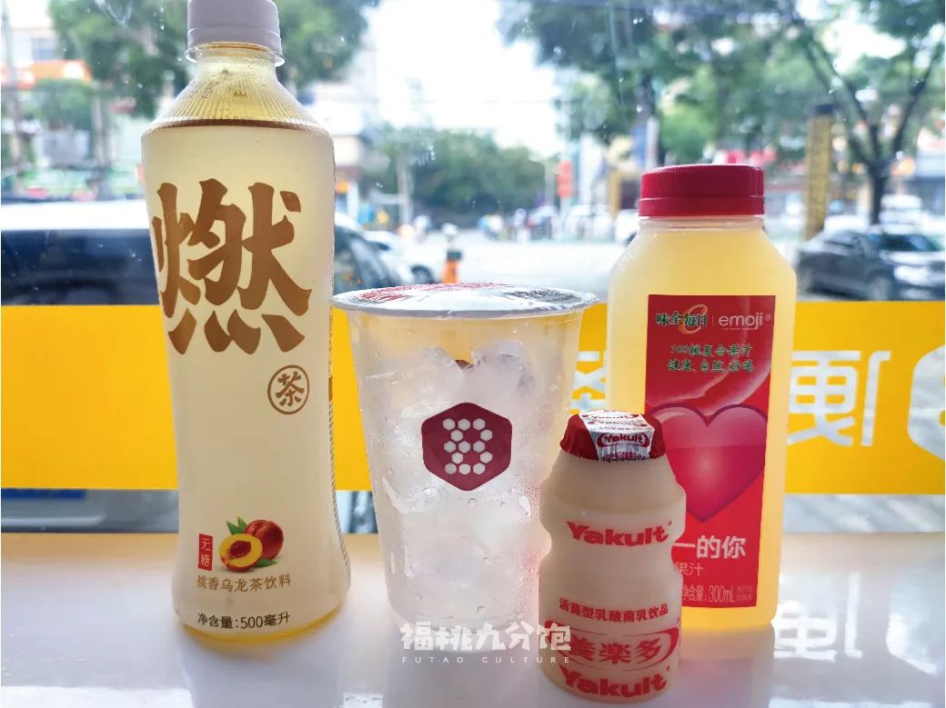製作配比:冰杯裏倒入一瓶養樂多,1/3瓶烏龍茶和1/3瓶桃汁,攪勻即可