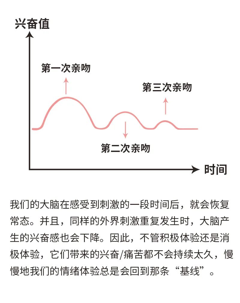 在親密關係中也是如此。再美滿的關係,我們的體驗也會趨於穩定和平淡。享樂適應會讓我們對於關係中的積極體驗敏感度下降,同時對於積極體驗的期待增加。